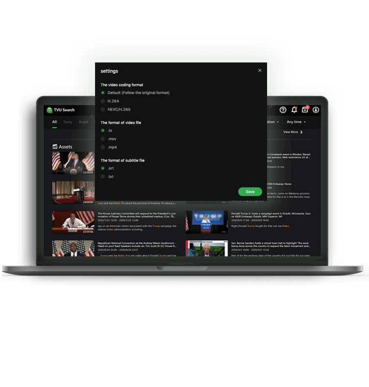 간단하고 효율적인 클리핑 도구를 사용하여 라이브 피드에서 원하는 컨텐츠를 어디서나 실시간으로 클리핑 및 다운로드할 수 있다. TVU Search의 음성 인식에서 원하는 텍스트를 선택하고 사용하면 더 매력적인 콘텐츠를 만들 수 있다.