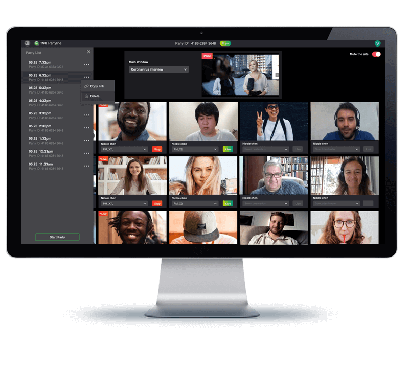 TVU Partyline permet une interaction virtuelle de qualité basée sur le cloud et une collaboration en temps réel pour les membres de l'équipe, les talents et les téléspectateurs participants dans divers endroits. TVU Partyline est une solution idéale pour les conférences de presse virtuelles ou les briefings média.